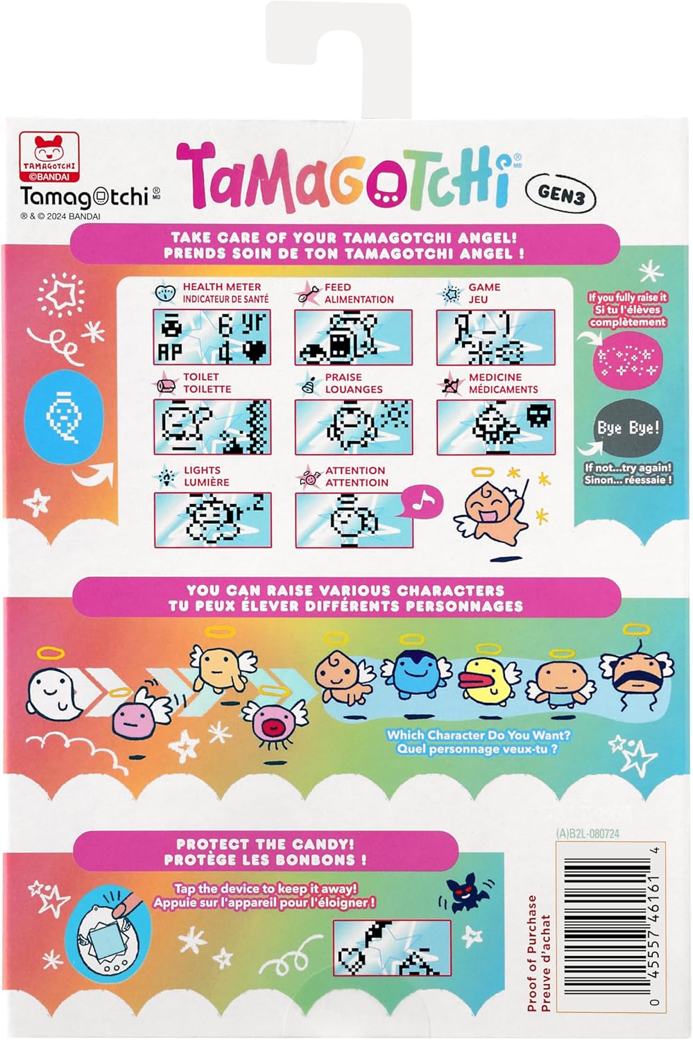 A tapping feature is also included! Tap the shell to bring your Angel Tamagotchi character back from a stroll. Or use the tap feature to scare off a bat that tries to steal candy.