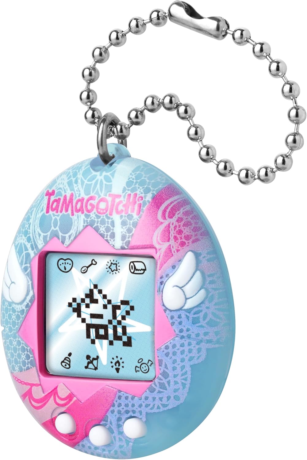 The Original digital pet you love with a Angel Lace shell design and three-dimensional wings! Comes with the Angel programming, the device will begin with the Obaketchi Angel (a ghost character) and depending on how you nurture your character will determine which of the 5 adult Tamagotchi Angel characters you will get. You feed it, clean up after it, and even praise it. Plus, you can play the Shooting Star mini game! Includes the CR2032 battery and attaches to your bag so it goes everywhere! Ages 8+